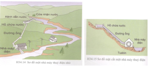 – Hoạt động của nhà máy thủy điện (hình H34.14, H34.15): nước từ dòng sông, dòng trên cao chảy đến hồ chứa rồi theo đường ống đổ vào nhà máy điện, làm quay tua bin của máy phát điện, tạo ra dòng điện dẫn đến các nhà máy, gia đình để chạy động vơ, thắp sáng đèn, đun nấy bằng bếp điện,…