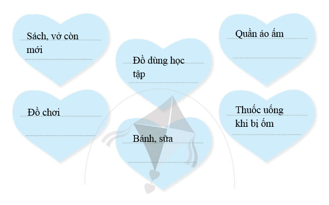Em cùng các bạn thảo luận về những món quà ý nghĩa dành tặng các bạn học sinh vùng khó khăn và viết vào ô dưới đây.