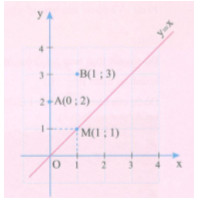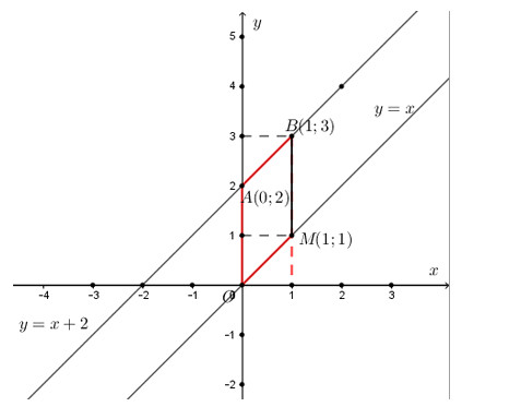 Vẽ các điểm \(O\left( {0;0} \right),M\left( {1;1} \right)\) thuộc đường thẳng \(y = x.\) Vẽ các điểm \(A\left( {0;2} \right),B\left( {1;3} \right)\) thuộc đồ thị hàm số