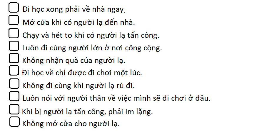 Em hãy đánh dấu X vào những lưu ý để phòng tránh bị bắt cóc.