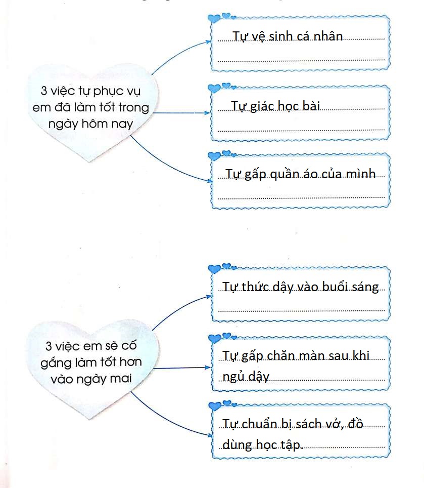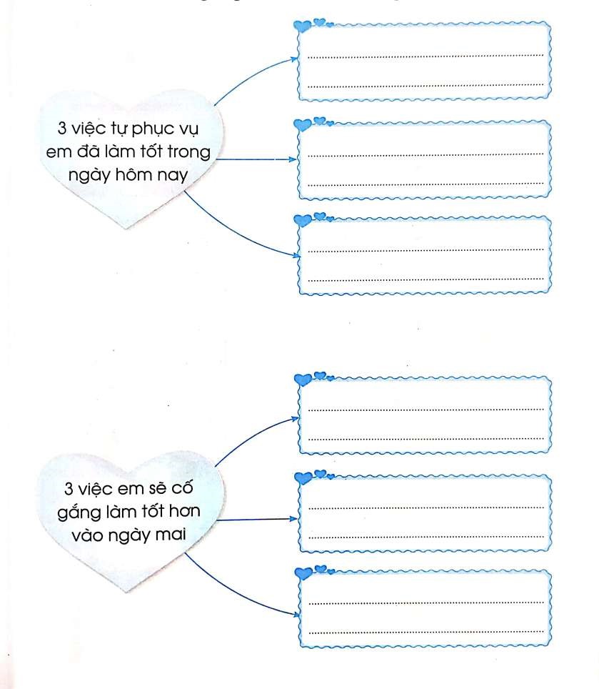 Hãy nêu 3 việc tự phục vụ em đã làm tốt trong ngày hôm nay và 3 việc em sẽ cố gắng làm tốt hơn vào ngày mai.