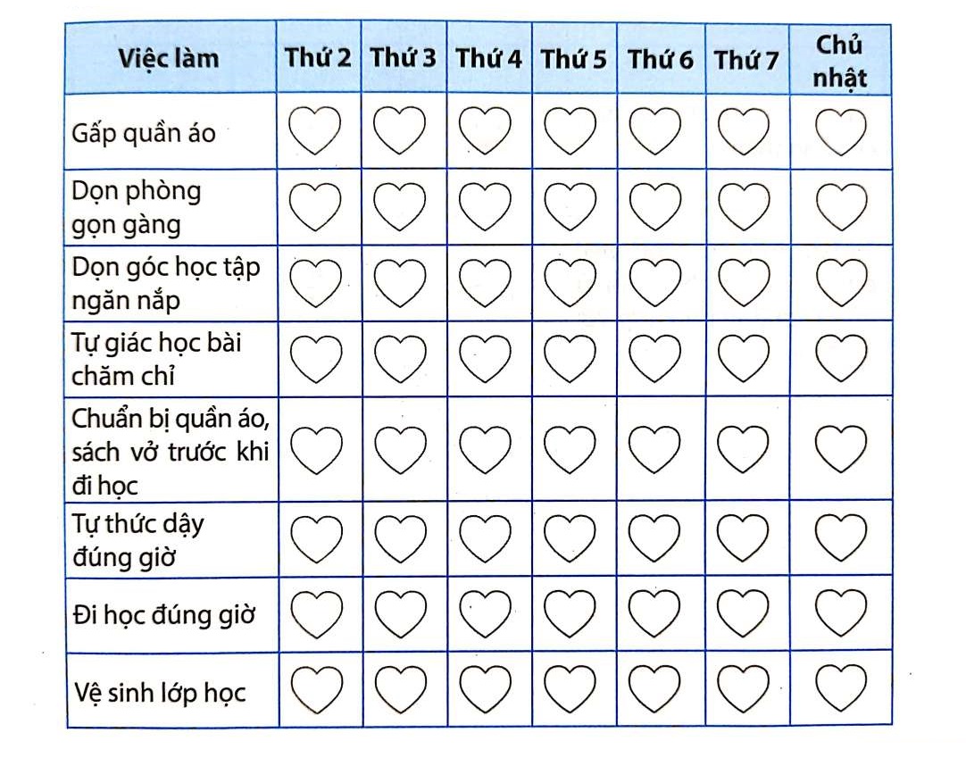 Em hãy tự thực hiện những công việc trong bảng, sau đó chọn màu sắc yêu thích rồi tô vào hình trái tim của ngày mà em đã tự thực hiện công việc đó.