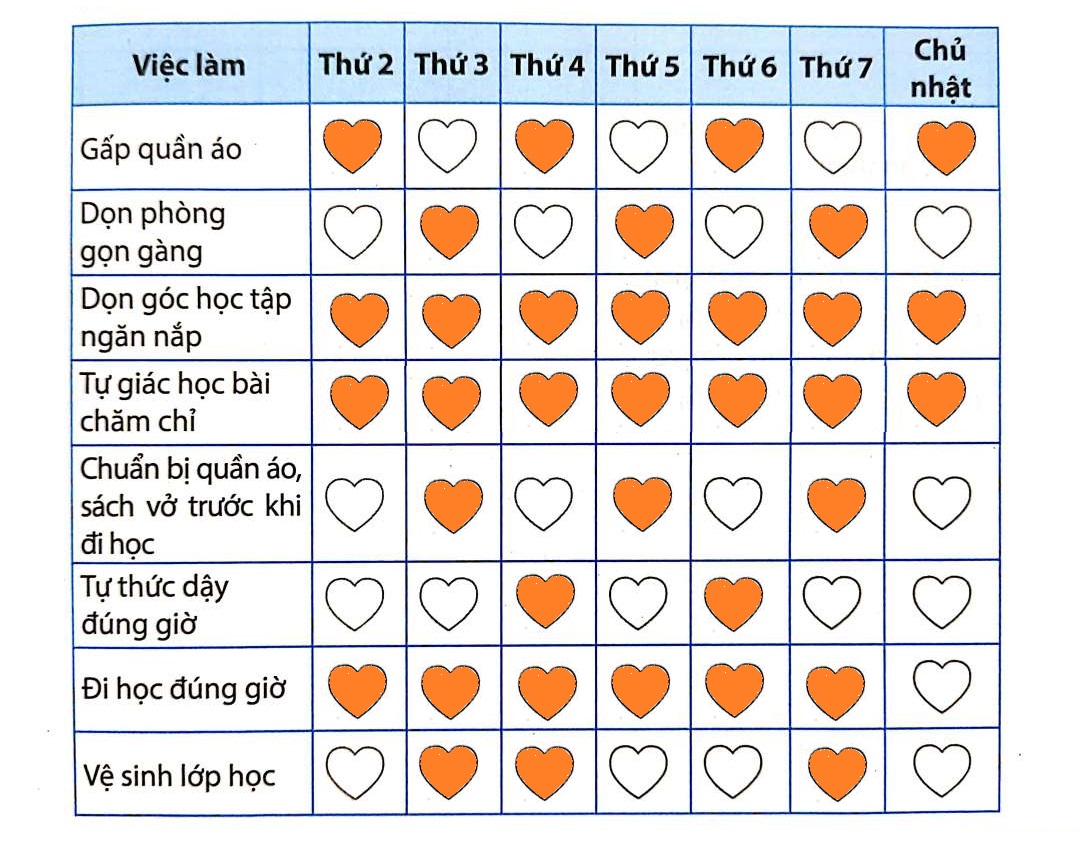 Em hãy tự thực hiện các việc làm phù hợp ở lớp, ở nhà rồi tô màu vào trái tim tương ứng với ngày em đã thực hiện.