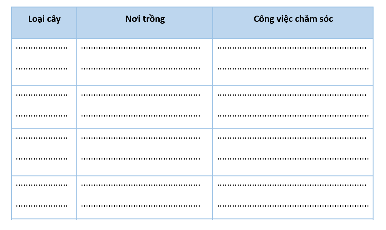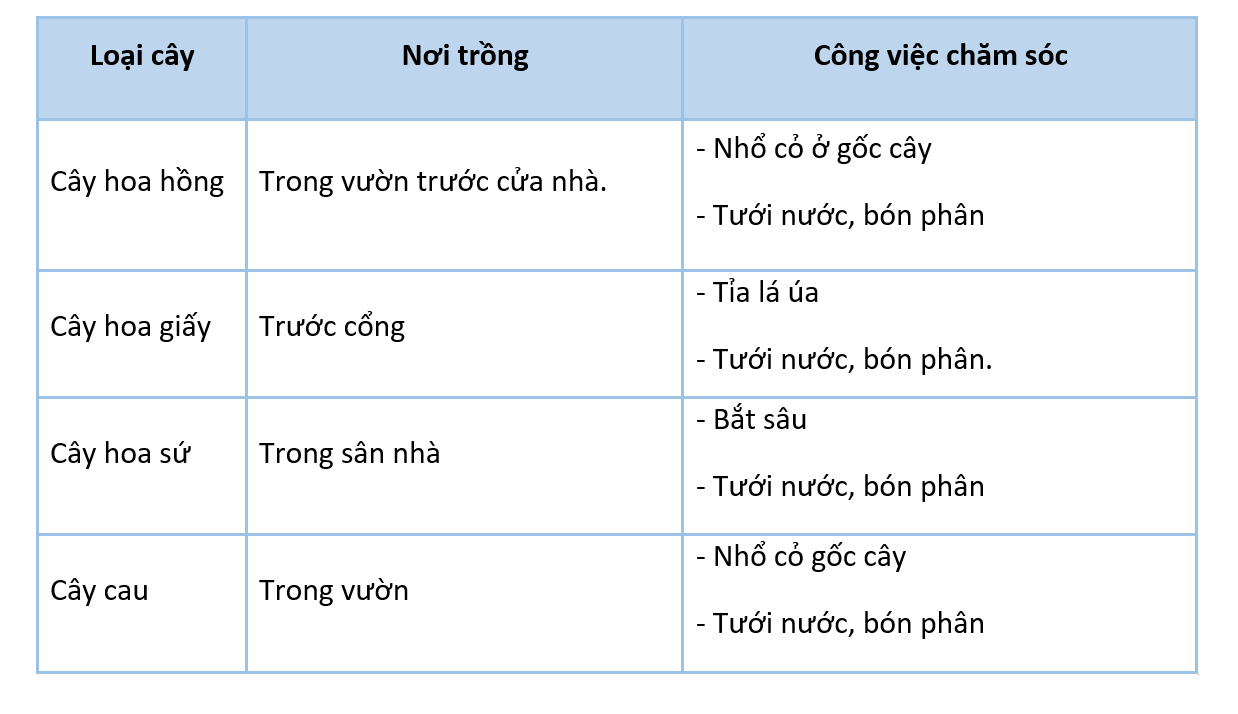 Em cùng người thân chăm sóc cây xanh ở gia đình rồi ghi lại kết quả thực hiện vào bảng sau: