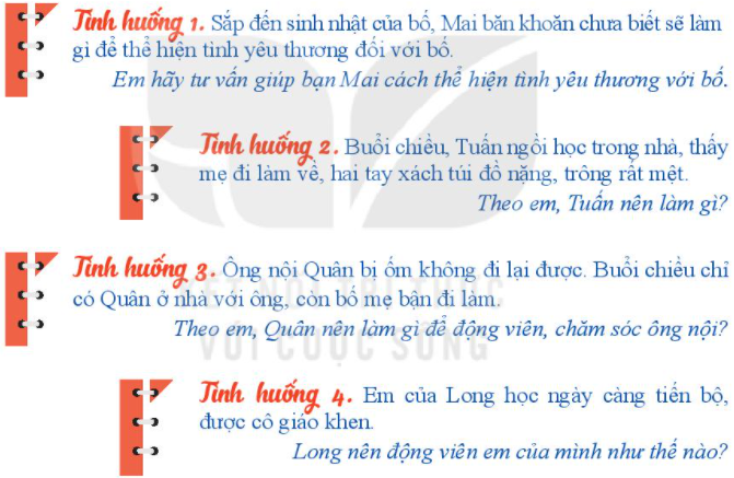 – Tình huống 1: Mai có thể cố gắng học tập thật tốt, đạt nhiều điểm 10 để bố vui. Mai có thể tự tay làm một món quà thủ công để tặng bố (một tấm thiệp, một bức tranh,…)