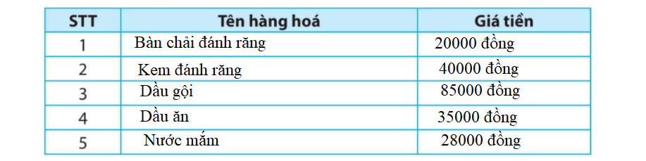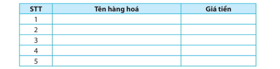Hỏi bố mẹ, người thân về giá của một số loại thực phẩm, đồ dùng sinh hoạt hằng ngày và điền vào bảng sau: