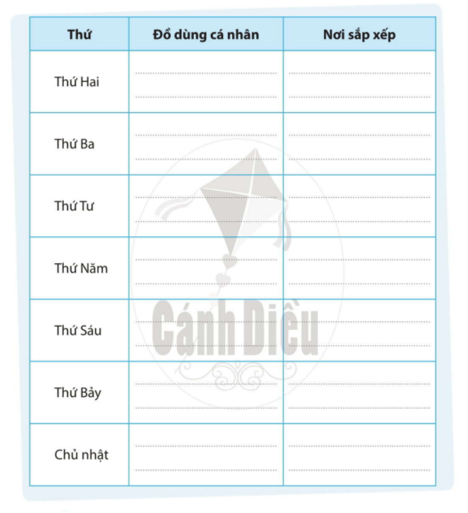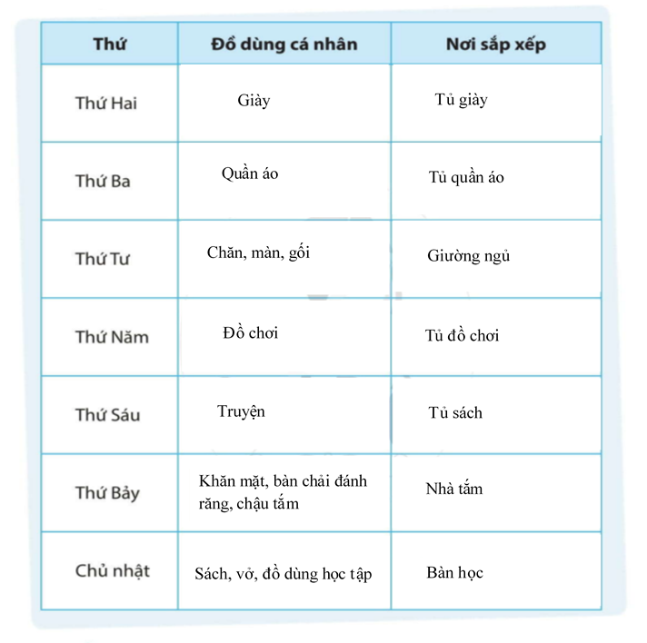 Xây dựng thời gian biểu sắp xếp đồ dùng cá nhân vào bảng dưới đây:
