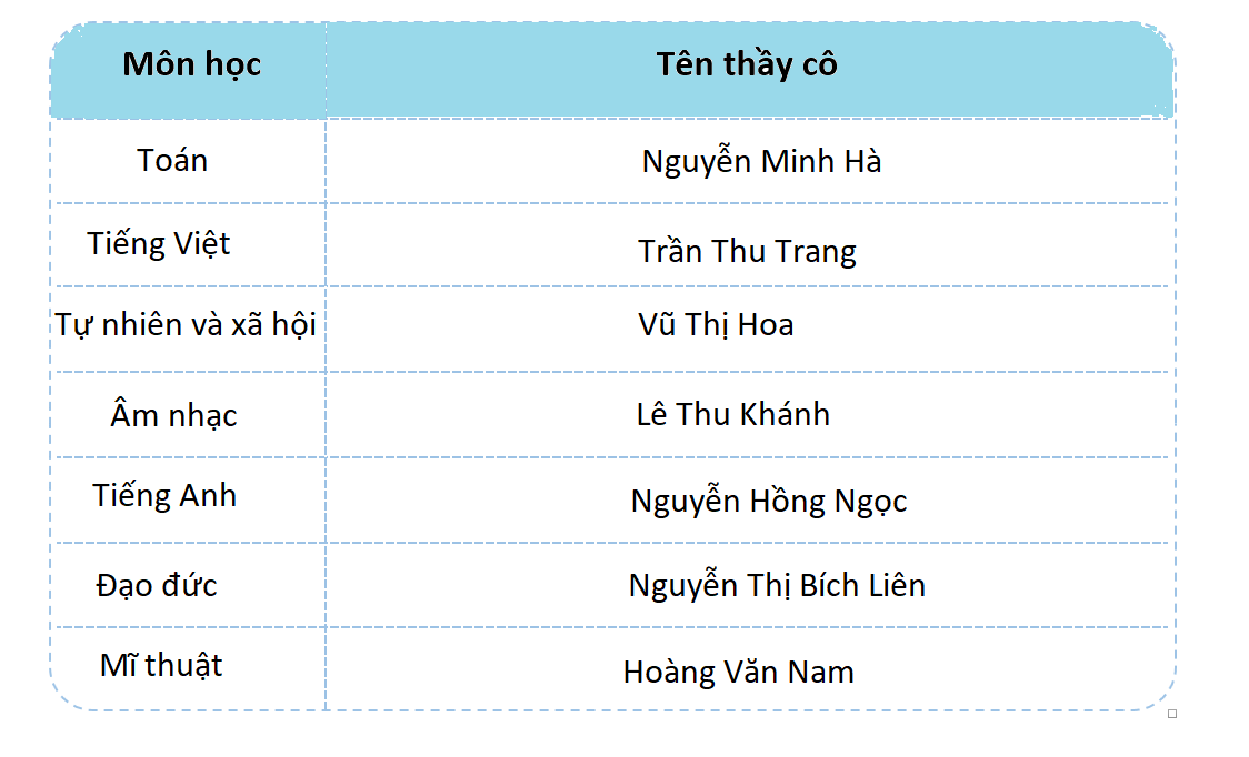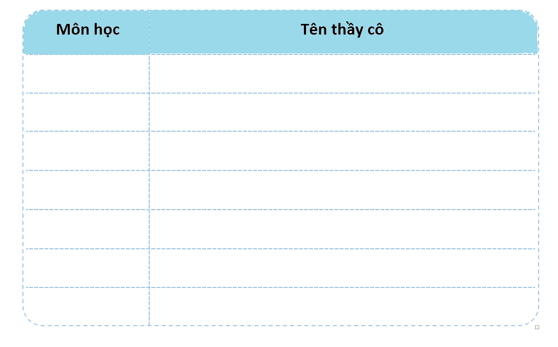 Em hãy ghi lại tên các môn học mà em được học, sau đó hỏi tên đầy đủ của thầy cô dạy môn đó và ghi lại vào bảng.