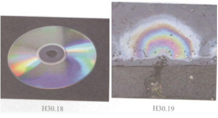 Tương tự, em hãy trả lời: Vì sao khi nhìn vào các váng dầu trên mặt nước bên đường, ta lại thấy được nhiều màu sắc (hình H30.19).