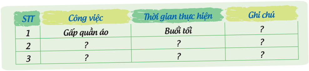 Liệt kê những công việc trong gia đình cần phải làm hằng ngày. Xác định những công việc em có thể thực hiện. Lập kế hoạch thực hiện các công việc đó theo gợi ý