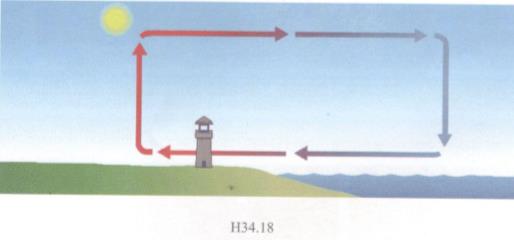 Em hãy giải thích sự hình thành của gió biển vào ban ngày (hình H34.18) và nêu lên quá trình chuyển hóa giữa các dạng năng lượng trong quá trình hình thành của gió biển.