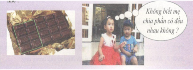 Giải bài tập Mẹ chia một thanh Chocolate thành hai phần cho hai bé Mèo và Long như trong hình (bé Mèo