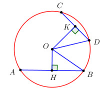 Ta có \(OH \bot AB,\,\,OK \bot CD \Rightarrow \) H, K theo thứ tự là trung điểm của \(AB,\,\,CD\).