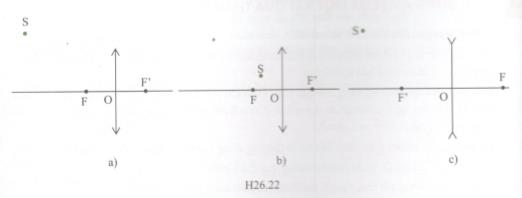 Trong mỗi trường hợp của hình H26.21, em hãy cho biết thấu kính là thấu kính hội tụ hay thấu kính phân kì, ảnh là thật hay ảo, cùng chiều hay ngược chiều với vật, lớn hay nhỏ hơn vật. Hãy dựng ảnh S’ của điểm sáng S qua thấu kính trong các trường hợp nêu ở hình H26.22.