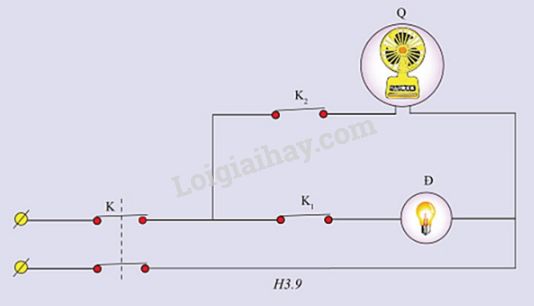 Trong một căn phòng, người ta lắp đặt một bóng đèn Đ và một quạt Q song song với nhau và nối vào nguồn điện có hiệu điện thế U = 220V. Mỗi thiết bị có một công tắc riêng K1, K2 ngoài ra còn có một cái ngắt an toàn K (cái CB) lắp vào mạch chính. Sơ đồ mạch điện được mô tả ở hình H3.9.