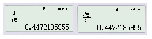 a) Dùng máy tính bỏ túi để tính và so sánh \(\dfrac{1}{{\sqrt 5 }}\) và \(\dfrac{{\sqrt 5 }}{5}\).