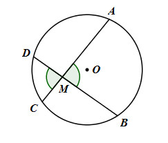 Lấy một điểm M bên trong đường tròn (O) và không trùng với tâm O. Qua M vẽ hai dây cung AC và BD. So sánh hai góc \(\widehat {AMB}\) và \(\widehat {CMD}\).­