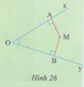 Cho điểm M nằm bên trong góc xOy sao cho khoảng cách từ M đến hai cạnh Ox, Oy bằng nhau (hình 26). Hãy so sánh góc AOM và góc BOM.