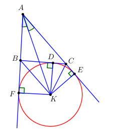 Gọi K là giao điểm đường phân giác của góc A với các đường phân giác của hai góc ngoài tại B và C của tam giác ABC. D, E, F lần lượt là chân đường vuông góc hạ từ K xuống các đường thẳng BC, AC, AB.