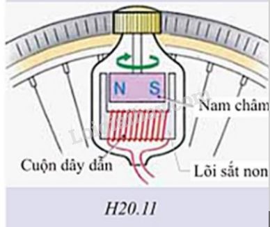 Hình H20.11 mô tả cấu tạo và hoạt động của một dynamo xe đạp (dynamo có nghĩa là máy phát điện). Hãy chỉ ra các bộ phận chính của máy. Bộ phận nào là rôto, stato? Nam châm của máy là nam châm vĩnh cửu hay nam châm điện? Có bộ phận chính nào của máy cần sử dụng bộ góp điện hay không? Dòng điện do máy phát ra là dòng điện xoay chiều hay một chiều, vì sao?