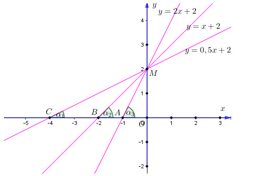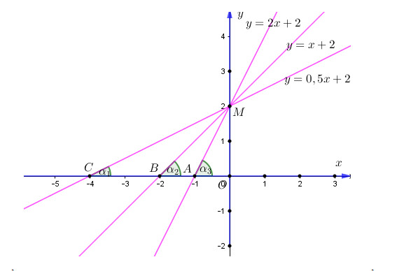Đường thẳng \(y = 2x + 2\) cắt trục Ox tại điểm \(A\left( { – 1;0} \right)\)  và đi qua điểm \(M\left( {0;2} \right)\) . Khi đó ta có góc giữa đường thẳng \(y = 2x + 2\) và trục Ox chính là góc \(\widehat {MAx} = {\alpha _3}\) .