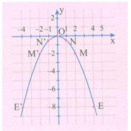 E (4; …), E’(-4; …), M(2; …), M’(-2; …), N(1; …), N’(-1; …) trên mặt phẳng tọa độ. Ta có đồ thị hàm số \(y =  – \dfrac{1}{2}{x^2}\) như hình bên.
