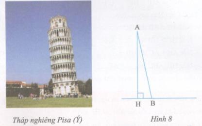Quan sát hình 8 là hình ảnh của tháp nghiêng Pisa (Ý). Trong đó, AB là hình ảnh của tháp, AH là khoảng cách từ đỉnh tháp đến mặt đất. Hãy so sánh độ dài của AB và AH.