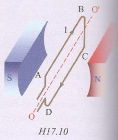 Hình H17.10 mô tả khung dây ABCD có dòng điện chạy qua và đặt trong từ trường của một nam châm. Ở vị trí này, lực điện từ tác dụng lên các cạnh AB, CD có phương, chiều như thế nào và có tác dụng làm quay khung dây hay không?