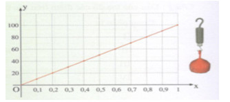 Khi Mạnh treo một quả cân y gam vào lực kế thì nó dài ra x (dm). Trên mặt phẳng tọa độ Oxy, các điểm M(x ; y) nằm trên đường thẳng màu đỏ như trong hình bên (mỗi đơn vị trên Ox tương ứng với 0,1 dm và mỗi đơn vị Oy tương ứng với 20g):