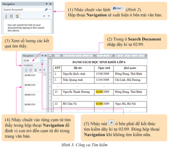– B4: Nháy chuột vào từng cụm từ tìm thấy trong hộp thoại Navigation để định vị con trỏ đến cụm từ đó trong trang văn bản.