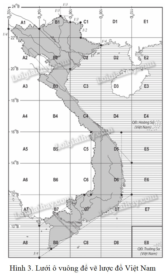 – Vẽ một lưới ô vuông gồm 40 ô (5×8) như trong hình 3. Mỗi chiều của ô vuông ứng với 2o kinh tuyến và 2o vĩ tuyến. Lưới ô vuông này thể hiện lưới kinh-vĩ tuyến từ 102o Đ đến 112o Đ và từ 8o B đến 24o B mà phần lớn  lãnh thổ nước ta nằm trong đó.