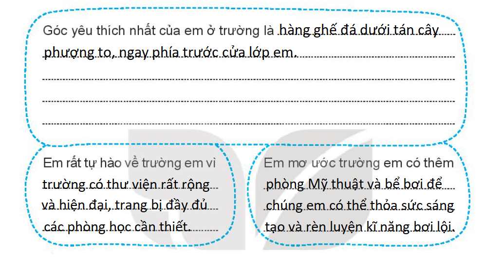 Nhớ lại xem điều gì khiến em thích đến trường, yêu trường và sẵn sàng khoe với mọi người về trường của em? Em mong muốn trường có thêm gì (thư viện, sân chơi, …) để em thích đến trường hơn nữa?