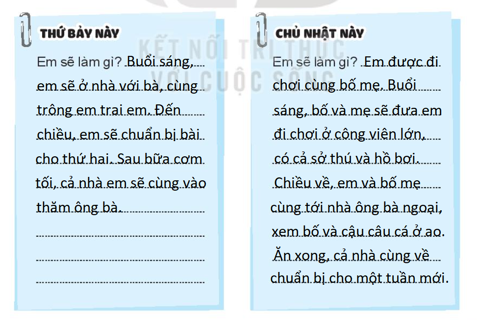 Hãy liệt kê những việc em định làm vào thứ bảy và chủ nhật ( đi thăm ông bà, đi công viên…)