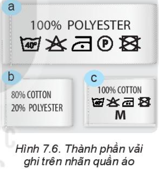 Đọc những nhãn quần áo trong Hình 7.6 cho biết trang phục đó được làm từ loại vải nào. Trong ba loại vải này, em thích chọn áo được làm từ loại vải nào hơn? Tại sao?