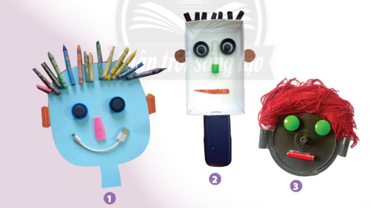– Các hình khuôn mặt dưới đây được tạo nên từ những vật liệu bút sáp màu, dây sạc, cúc áo, nắp bút…những vật liệu đã qua sử dụng