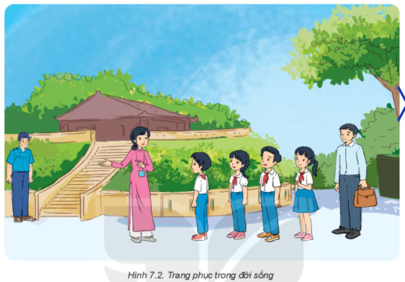 Quan sát Hình 7.2 và cho biết các nhân vật trong hình sử dụng trang phục gì. Nêu vai trò của các bộ trang phục đó.
