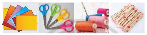 Các tấm bìa thủ công nhiều màu sắc, kéo, bút chì, thước, kim, chỉ, đũa tre và sách giáo khoa Toán 7, tập hai.