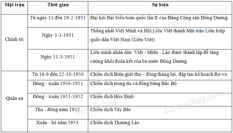 Lập bảng các niên đại và sự kiện thắng lợi có ý nghĩa chiến lược của quân dân ta trên các mặt trận quân sự, chính trị trong kháng chiến chống Pháp từ thu – đông 1950 đến trước đông – xuân 1953 – 1954.