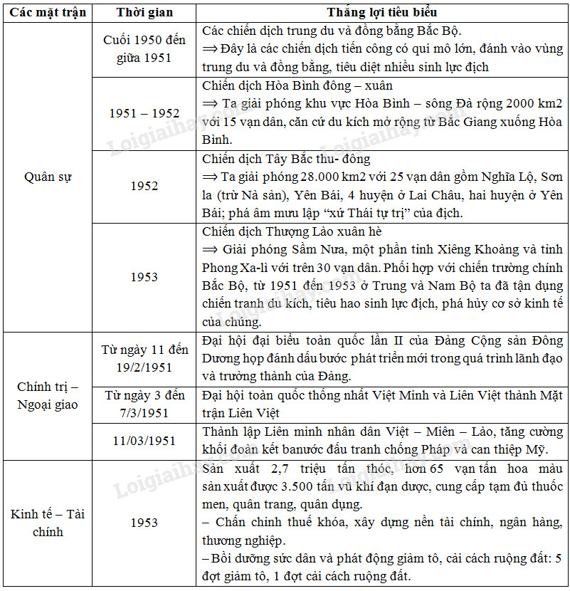 Lập niên biểu những thắng lợi tiêu biểu của quân dân ta trên các mặt trận quân sự, chính trị-ngoại giao, kinh tế-tài chính trong kháng chiến chống thực dân Pháp từ sau thu-đông 1950 đến trước đông xuân 1953-1954