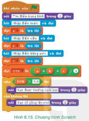 – HS có điểm Toán được 9, điểm Văn là 8 và điểm Tiếng Anh là 10. Khi đó dữ liệu đầu vào là a = 9, b = 8, c = 10, chương trình tính ĐT = (9 + 8 + 10)/3 = 8.3, vì ĐTB > 8 nên đầu ra chương trình thông báo “Bạn được thưởng sao.