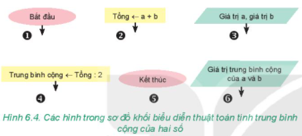 Em hãy sắp xếp các phần được đánh số trong Hình 6.4 để được thuật toán tính trung bình cộng của hai số a và b.
