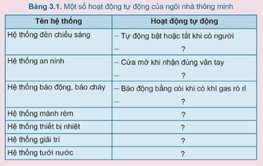 Hãy kể tên các hoạt động tự động của các hệ thống ngôi nhà thông minh theo bảng 3.1.