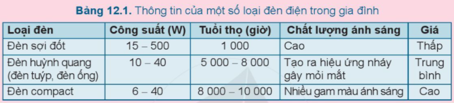 Khi lựa chọn đèn điện cần dựa vào nhu cầu sử dụng mà chọn loại đèn có công suất định mức, tuổi thọ, chất lượng ánh sáng và giá sao cho phù hợp. Dựa vào Bảng 12.1, em hãy lựa chọn loại đèn điện phù hợp với gia đình em