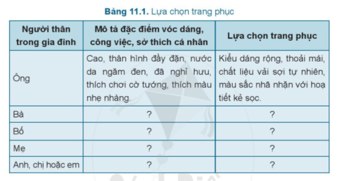 Dựa vào đặc điểm hình dáng bên ngoài, công việc và sở thích của người thân trong gia đình, em hãy lựa chọn trang phục phù hợp với từng người theo mẫu Bảng 11.1.