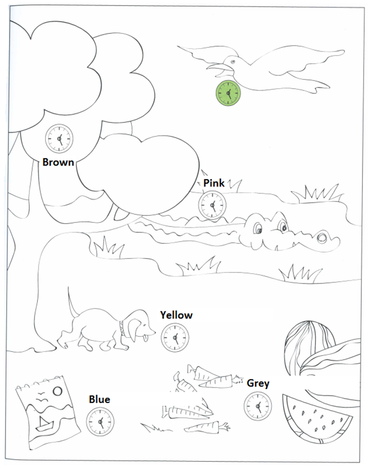 MAN: Colour the clock on the tree brown. (Hãy tô nó màu nâu nhé.)