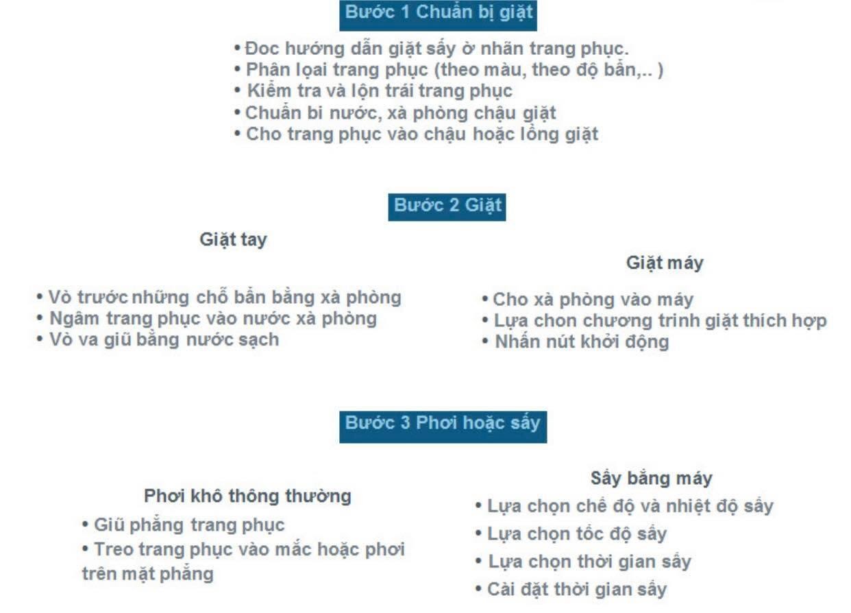Sơ đồ các bước giặt, phơi hoặc sấy