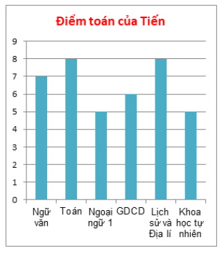 Biểu đồ trên cho thấy: Điểm ngữ văn của Tiến cao hơn Mai, điểm Toán của hai bạn bằng nhau, điểm Ngoại ngữ 1 của Mai cao hơn tiến