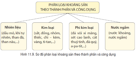 + Theo trạng thái vật lí: khoáng sản rắn (sắt, nhôm, thiếc,…) khoáng sản lỏng (dầu mỏ, nước ngầm,…) và khoáng sản khí (khí thiên nhiên).