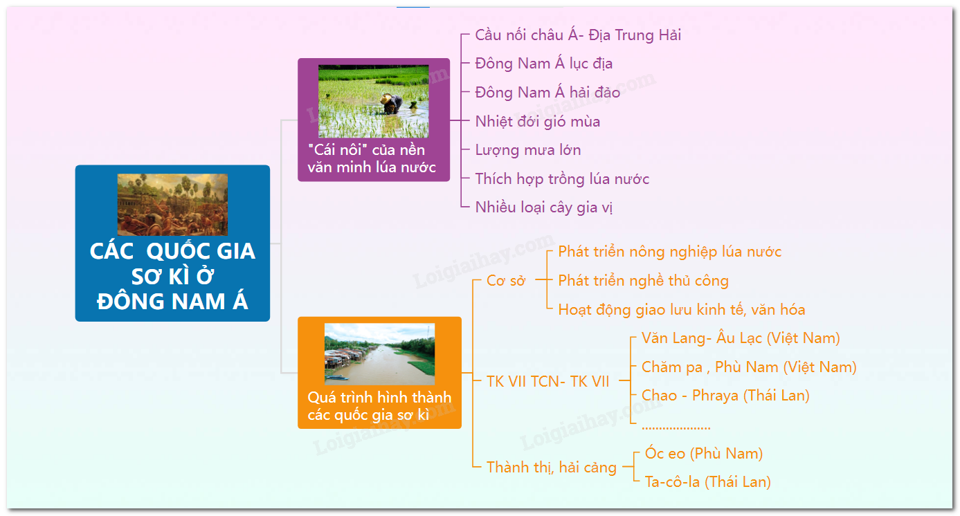 – Khoảng thế kỉ VII TCN đến thế kỉ VII, khu vực Đông Nam Á đã làn lượt xuất hiện các quốc gia sơ kì như Văn Lang – Âu Lạc, Chăm-pa, Phù Nam, các vương quốc ở hạ lưu sông Chao Phray-a (Thái Lan) và các đảo thuộc In-đô-nê-xi-a hiện nay.