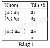 Bảng tần số ghép nhóm được lập như ở bảng 1, trong đó mẫu liệu gồm n số liệu được chia thành m nhóm ứng với m nửa khoảng [a1; a2); [a2; a3); …;[am; am+1), ở đó